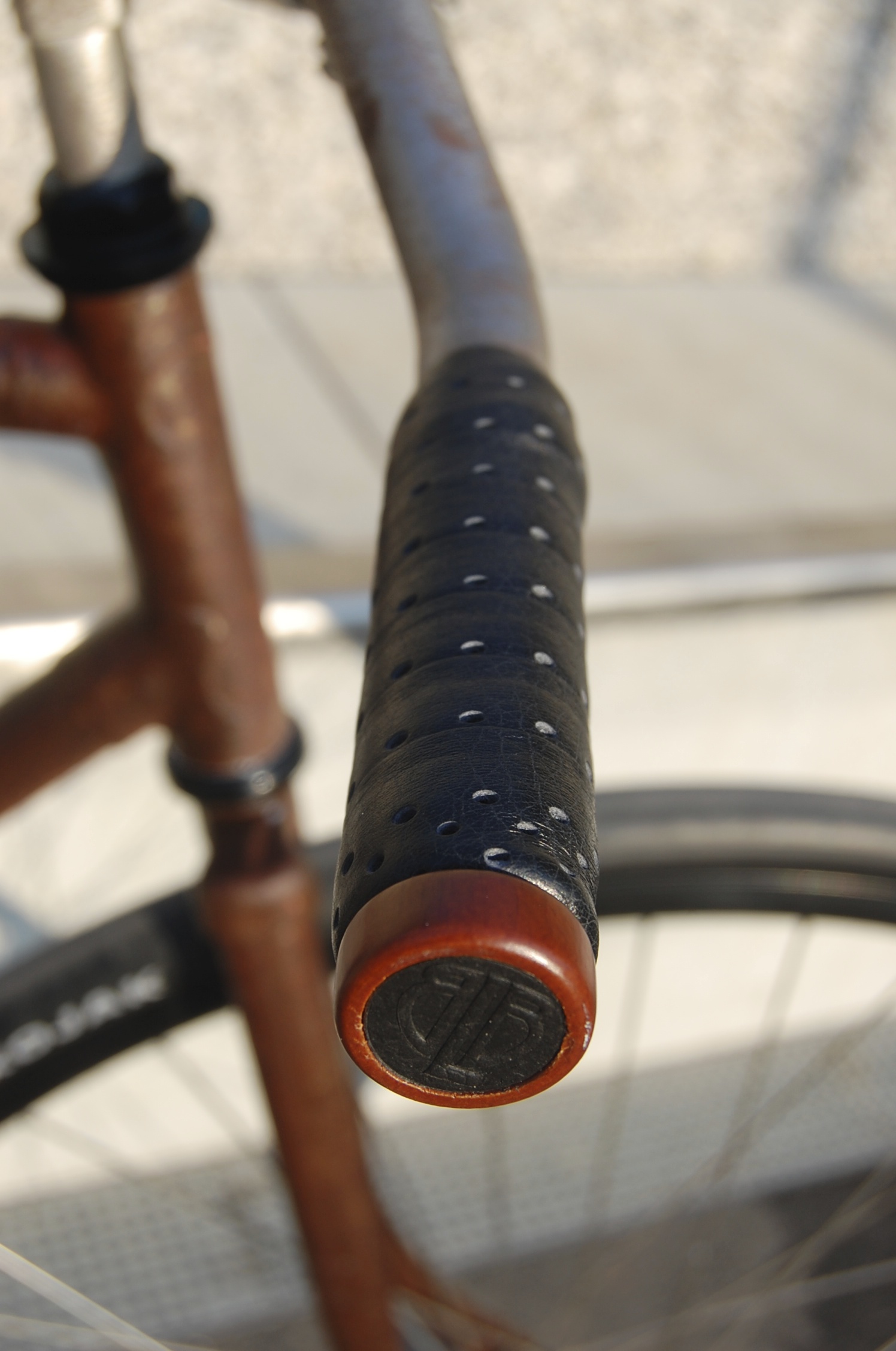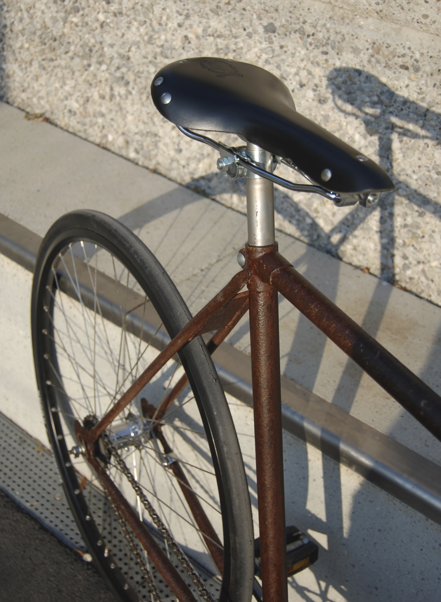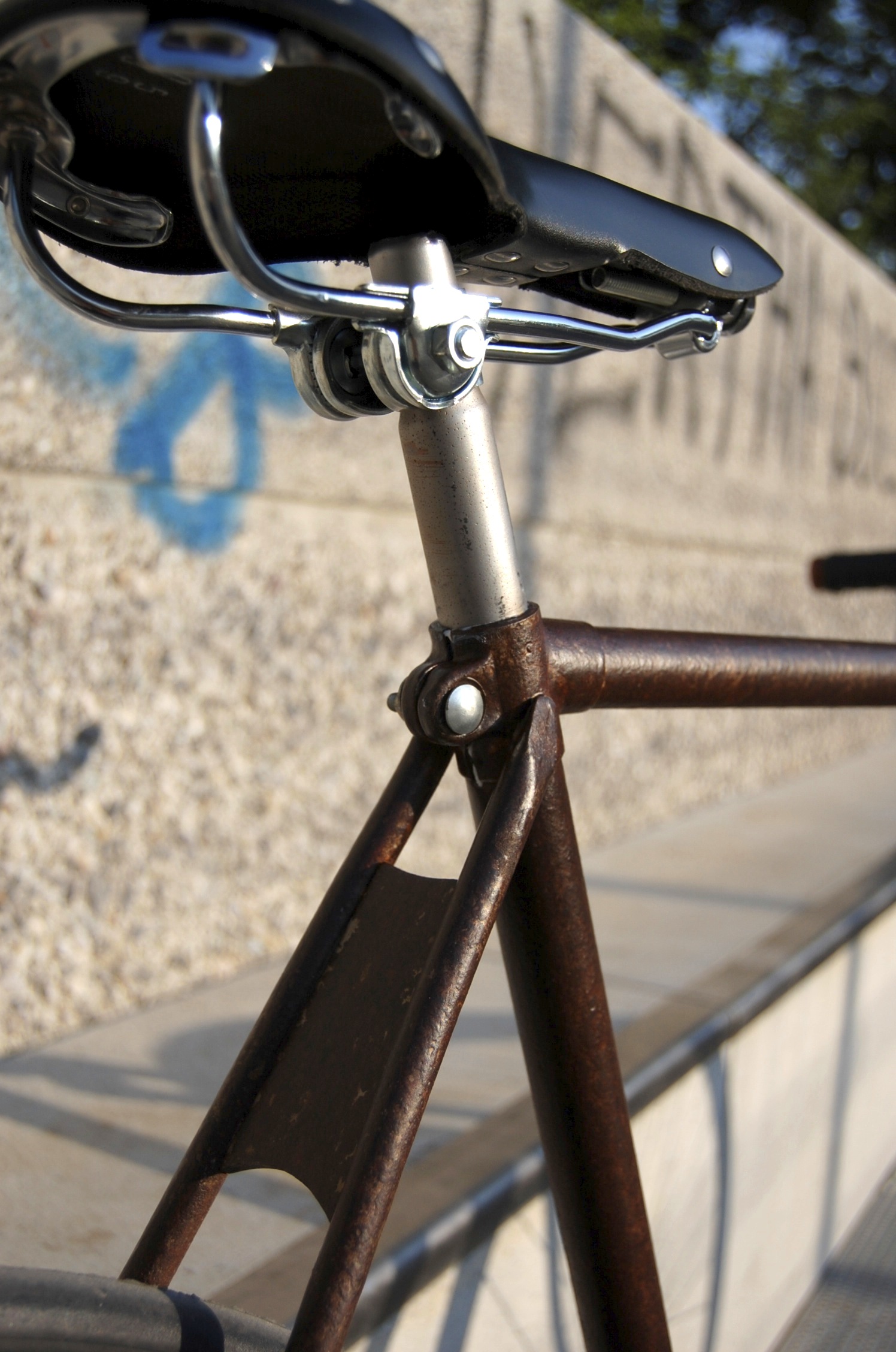 Es wurde zerlegt und der alte Lack entfernt. Der Rahmen wurde anschließend bearbeitet und die rostige Stahloberfläche hergestellt, die als Finish eine mattierte Lackierung erhalten hat. Neben dem Rahmen sind Sattelstütze, Lenker, Vorbau, Naben und sämtliche Schrauben original. Alles andere ist neu und bildet einen tollen Kontrast zu den alten Bestandsteilen. Schwarzer Ledersattel, Lenkerband und Lenkerstopfen harmonieren super mit der warmen und rostigen Struktur der Rahmenoberfläche. Kurbel, Kettenblatt und Laufräder nehmen die Oberfläche von Sattelstütze und Vorbau wieder auf.